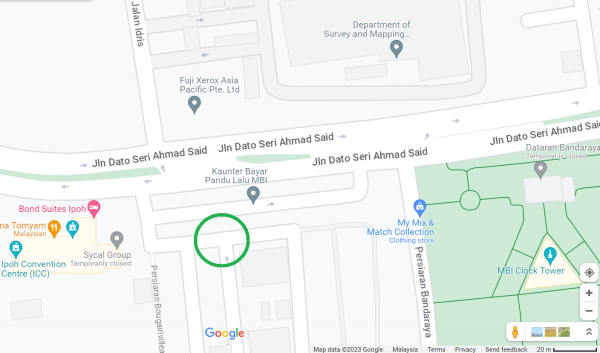 Lokasi Madrasah Nujumiah kini, secara dekat (Google Maps): Sekitar Kaunter Bayar Pandu Lalu Bangunan Majlis Bandaraya Ipoh (MBI).